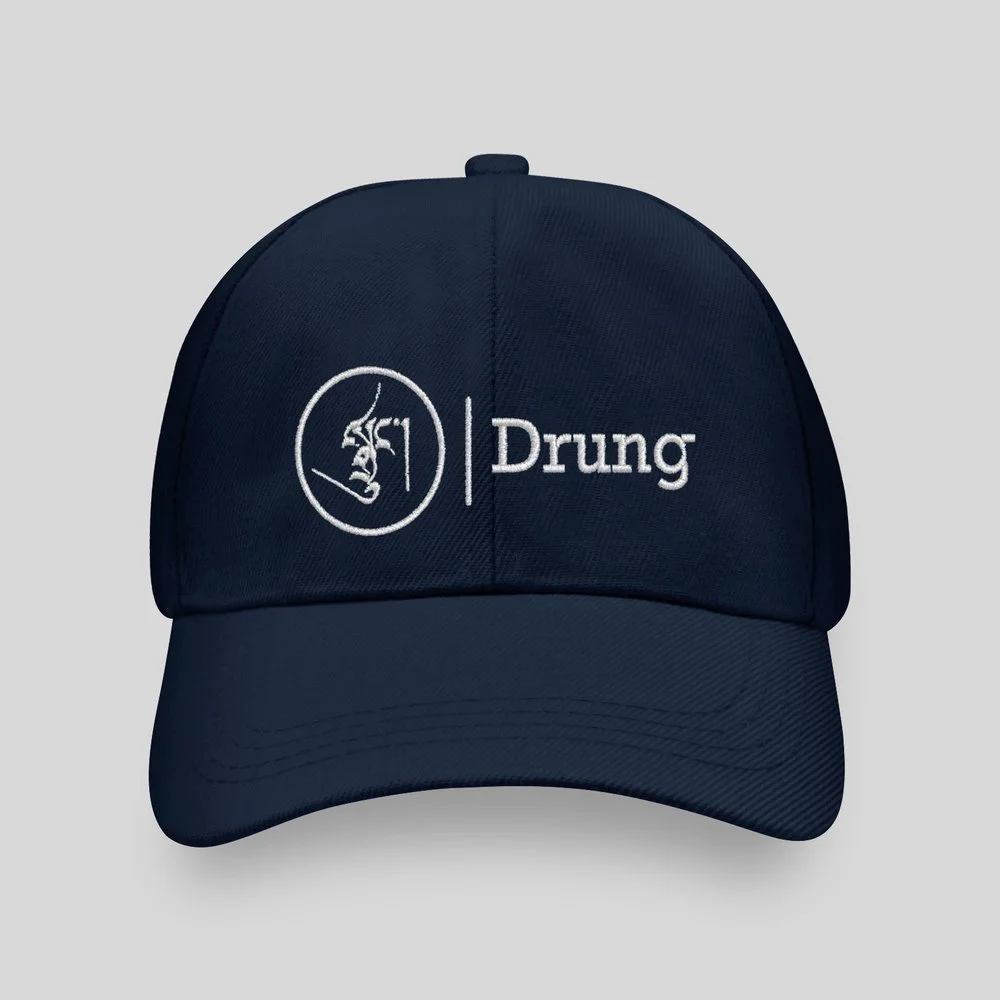 This American-style blue baseball cap features Drung’s embroidered custom calligraphy logo, created by Sodhon, a Tibetan artist known for his bold, contemporary approach to traditional Tibetan calligraphy.